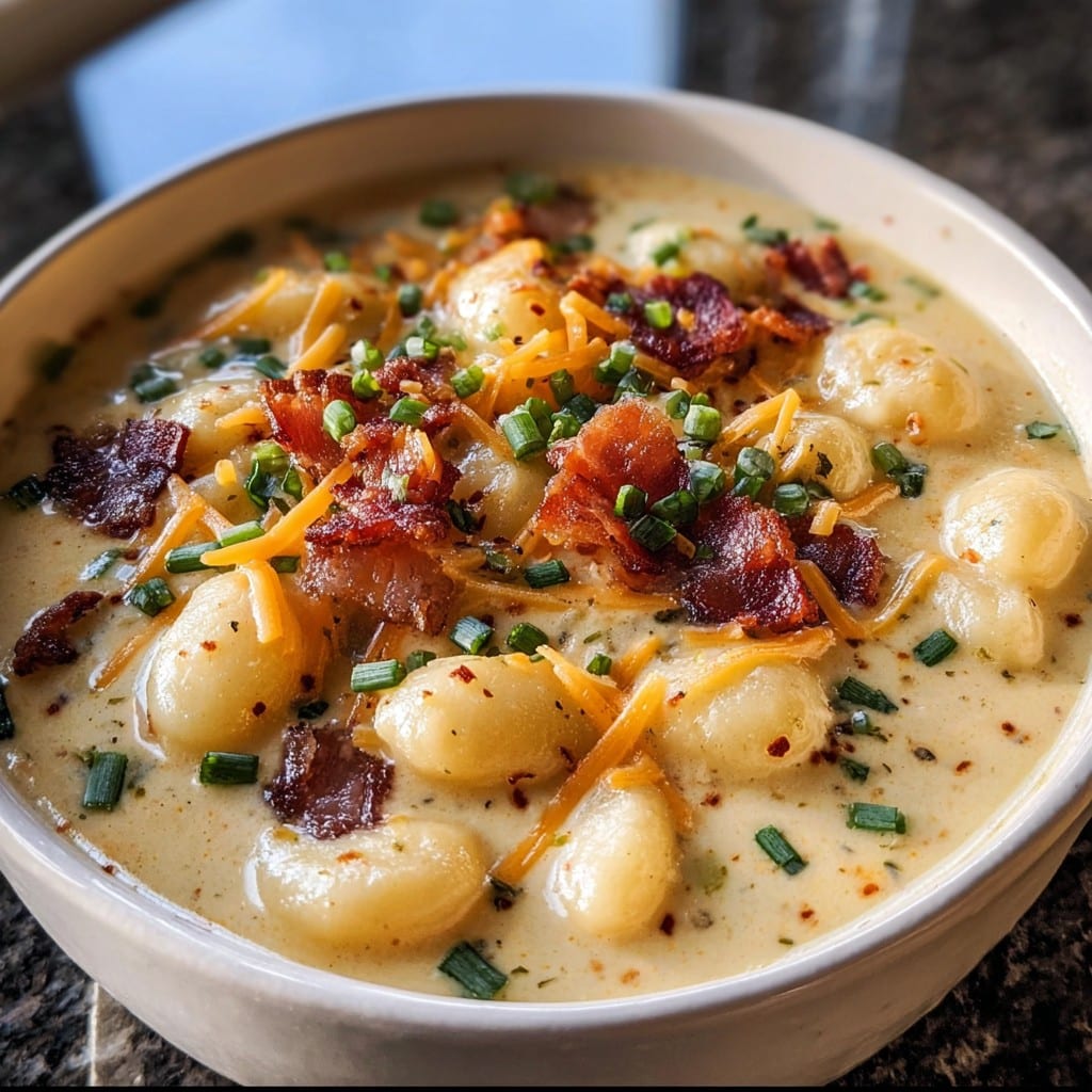 A rich and creamy soup filled with pillowy gnocchi, crisp bacon, sharp cheddar cheese, and savory vegetables—perfect for cozy dinner comfort.