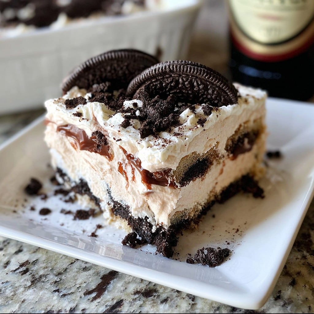This indulgent creation combines the rich allure of Baileys Irish Cream with the nostalgic crunch of chocolate sandwich cookies, layered between clouds of silky cream cheese and whipped topping.
