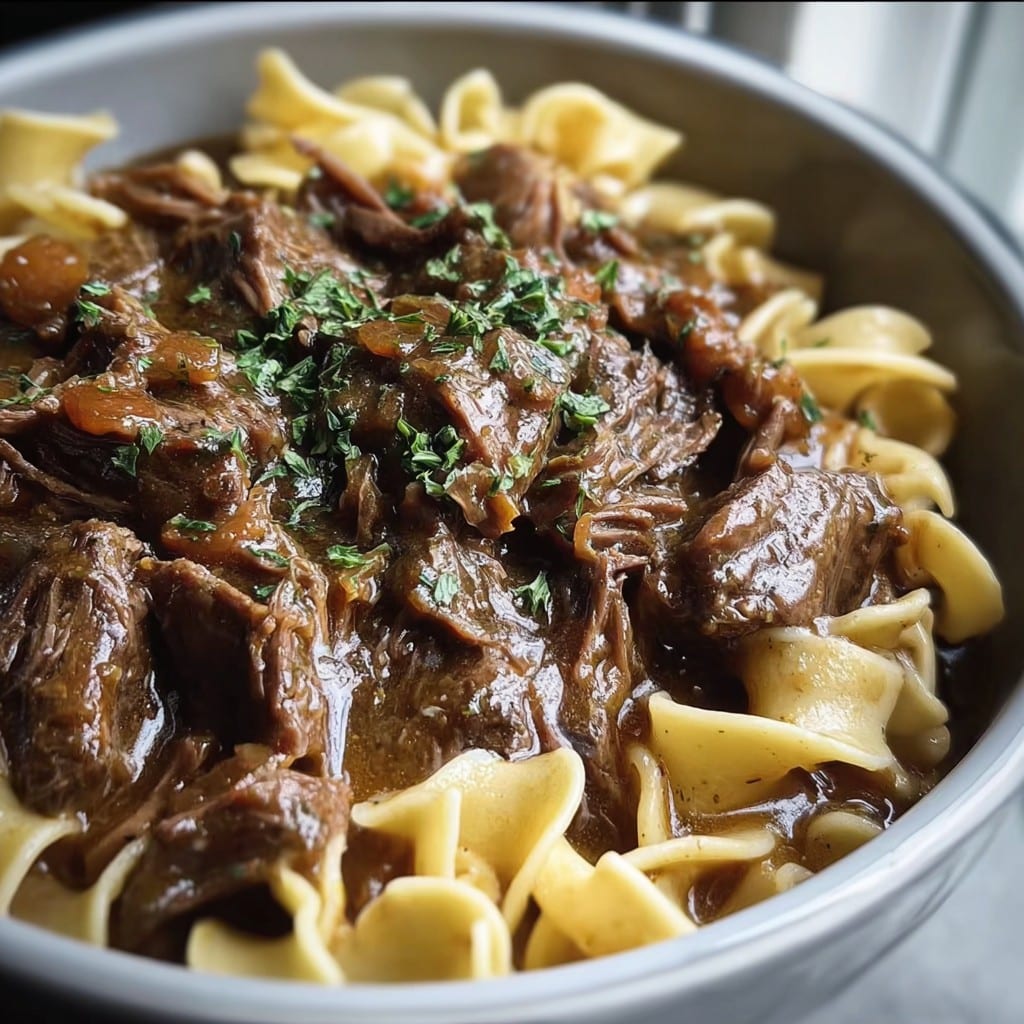 - About 30 minutes from the end, fish out the beef and shred it with two forks. It should basically fall apart; if not, put it back in for a bit—no judgment. Return the beef, stir in noodles, and let them cook straight in the juice. (This is where it always looks weird—don’t fret, it all sorts itself out.)