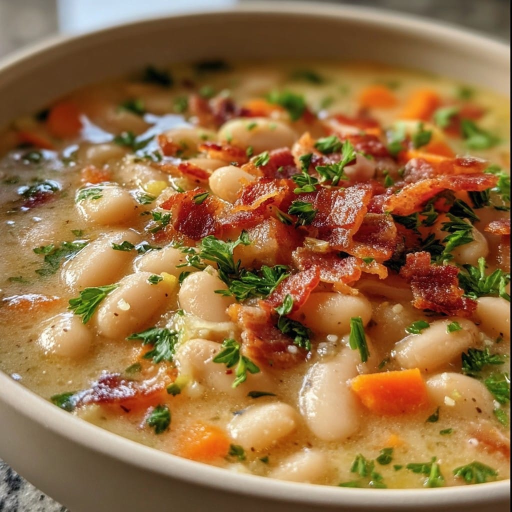 A hearty and warming soup packed with tender white beans, smoky bacon, and aromatic vegetables, perfect for comforting dinners on chilly days.